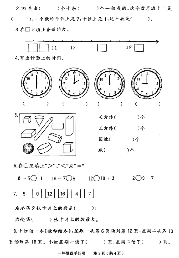 2022年人教版一年级上册数学期末测试卷二(图片版)(2)