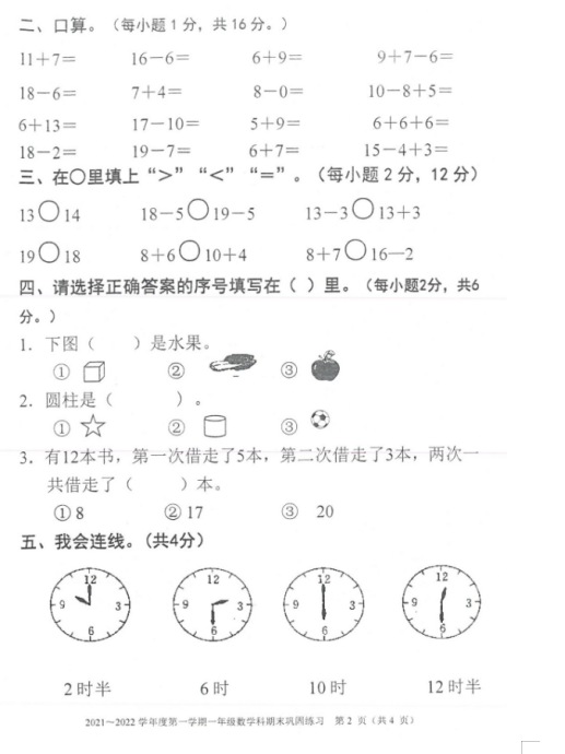 2022年北师大版一年级上册数学期末测试卷十五(图片版)(2)