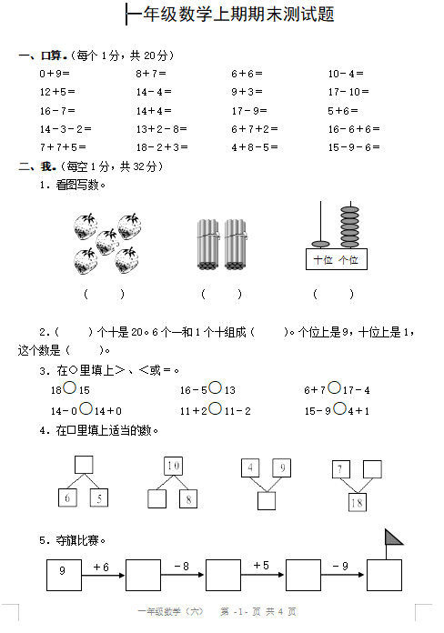 下载链接:2022年西师大版一年级上册数学期末测试卷三(下载版)