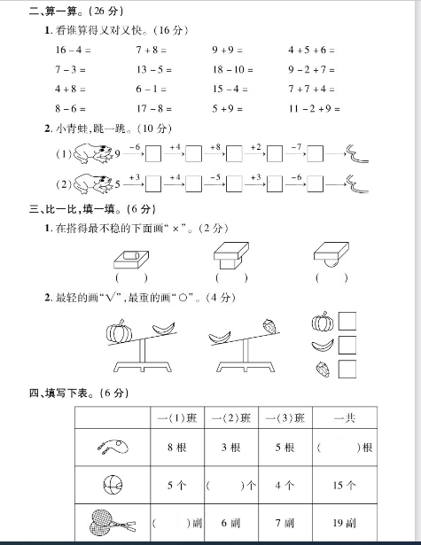 2022年西师大版一年级上册数学期末测试卷六(图片版)(2)