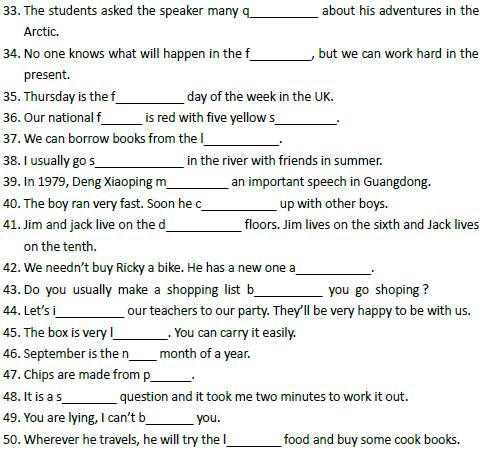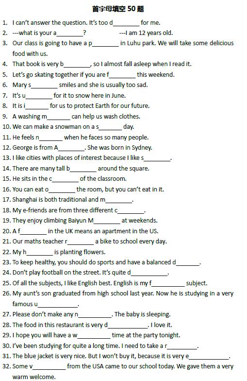 小升初英语首字母填空50题