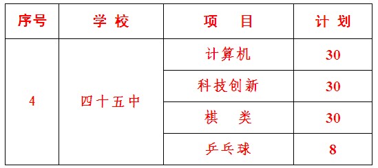 今年部分初中学校继续招收体育、计算机、科技创新等方面的特长生,不再招收英语、艺术类特长生(具体见附件三)。招收的特长生名单和类别,要在毕业学校和录取学校张榜公示。根据市教育局关于加强招收特长生工作管理的要求,各招收特长生的学校不得对学生进行学科类内容的考试或测试。各类特长生,由区招生办公室统一审核。