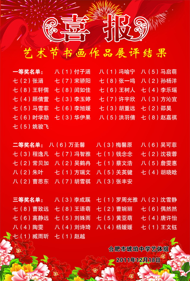 合肥琥珀中学艺术节书画作品展获奖名单 合肥市琥珀中学网站 2011-12-20 09:20:41 合肥市琥珀中学艺术节书画作品展评获奖名单: 推荐阅读: 合肥市琥珀中学内幕大揭秘 2011琥珀中学中考成绩 小升初家长谈合肥寿春中学 合肥市十二所重点中学信息整理