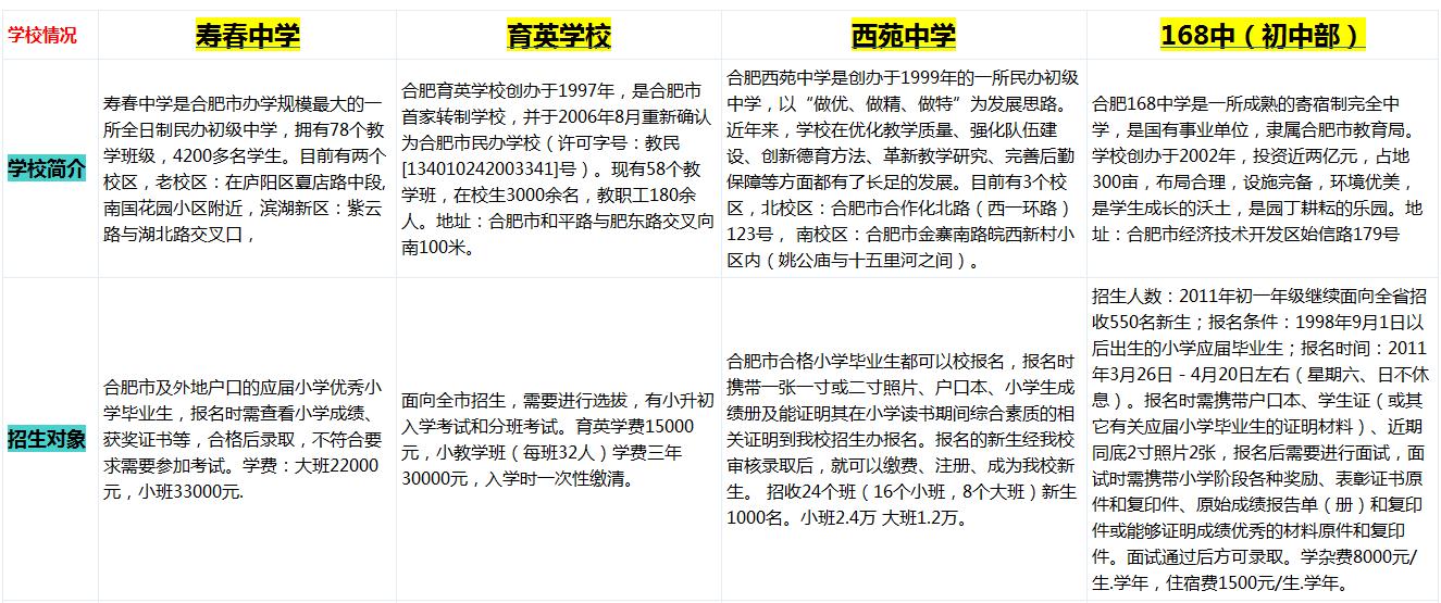 2012年小升初是一场激烈的暗战,为了方便合肥的家长朋友们了解各中学相关信息,这里对合肥市四大民办中学:寿春中学、育英中学、西苑中学和168中学初中部进行了一个分析对比,家长朋友们可参考。(原帖地址:http://bbs.eduu.com/thread-1182651-1-1.html)