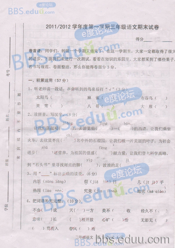 2011年-2012年包河区小学三年级上语文期末统考试卷 合肥e度论坛原创 2012-01-19 17:27:33 2011年-2012年包河区小学三年级上册语文期末统考试卷 试题预览: 具体查看:2011年-2012年包河区小学三年级上语文期末统考试卷