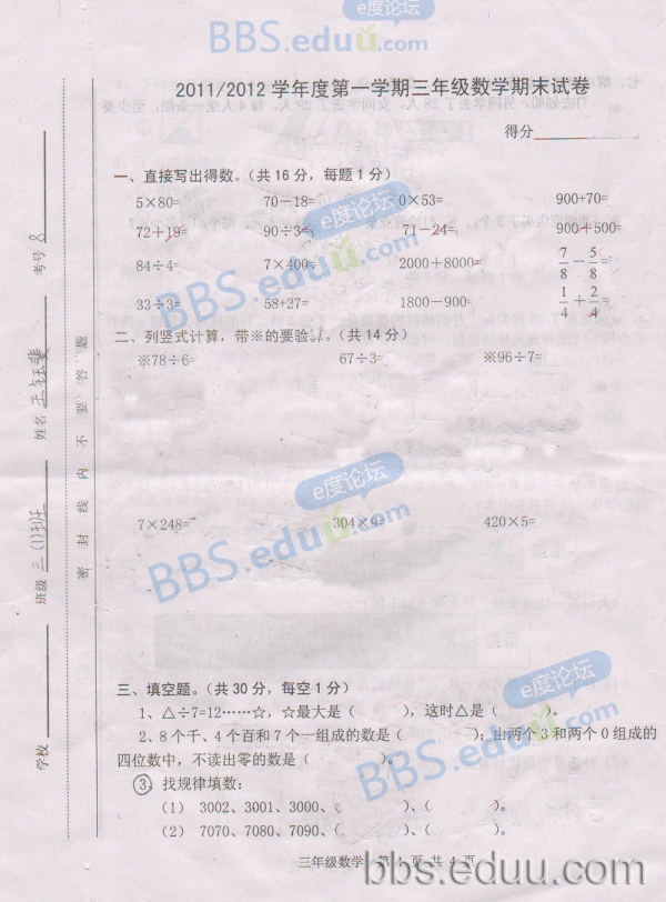 2011年-2012年包河区小学三年级上数学期末统考试卷 合肥e度论坛原创 2012-01-19 17:38:38 2011年-2012年包河区小学三年级上册数学期末统考试卷 试题预览: 具体查看:2011年-2012年包河区小学三年级上册数学期末统考试卷