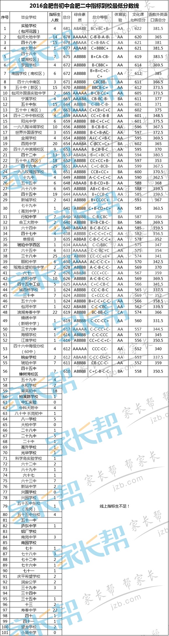 2016年合肥二中指标生到校最低分数线