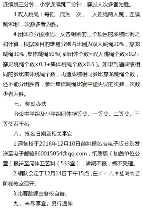 为了促进校园体育活动的开展,推进我区阳光体育运动,增强中小学生的身体素质和预防疾病的能力,丰富中小学生的大课间活动,培养学生团结协作的精神。经研究决定,于2016年12月16日在四十八中望湖校区举办包河区第九届中小学跳绳比赛,请各校广泛动员,积极参赛。