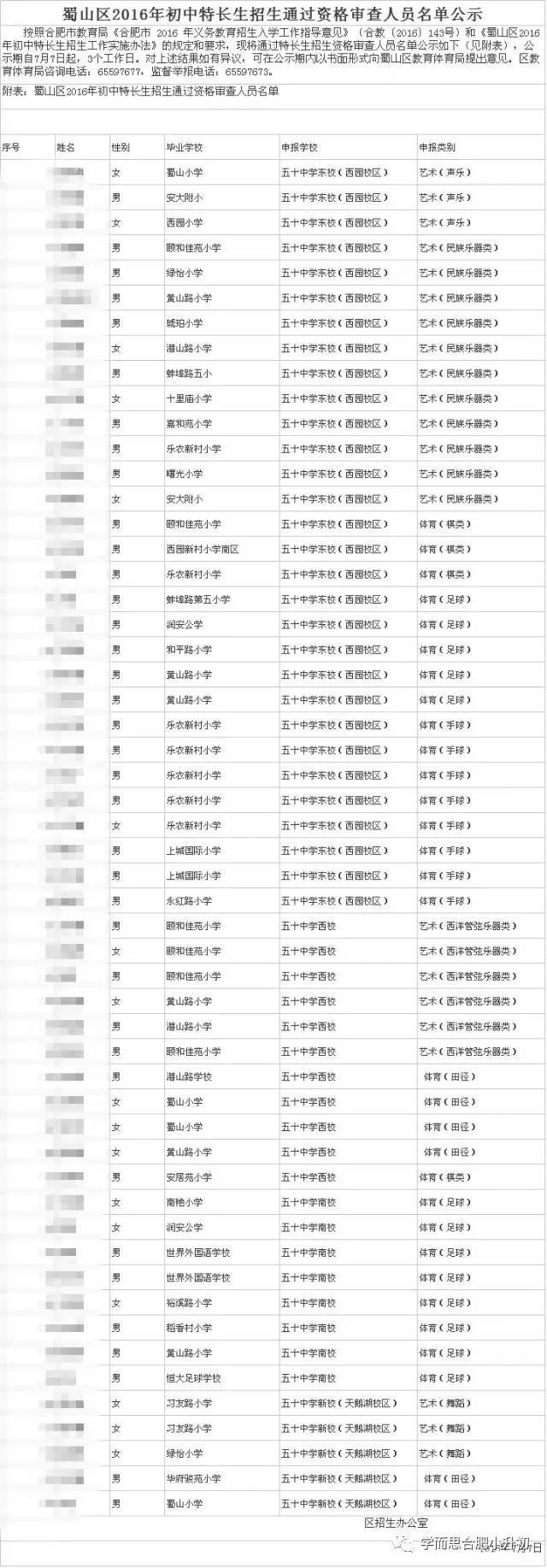 五十中西区:合肥五十中西区拟向全区各小学毕业班招交响乐特长生。如:小号,长号,圆号,大号,长笛,单簧管,双簧管,大管,小提琴,中提琴,大提琴,低音提琴,大鼓,小军鼓,镲等。咨询电话:13966709879 袁杰老师?