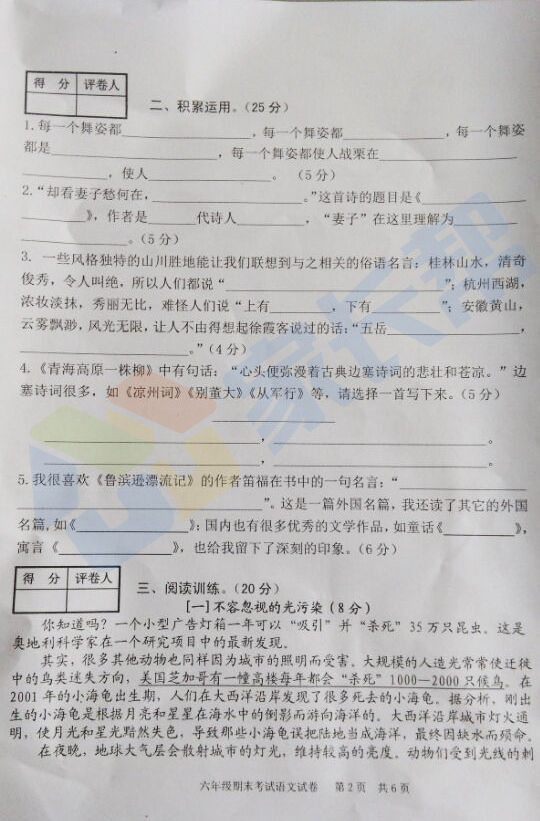 2016-2017学年合肥庐阳区六年级期末语文试卷(2)