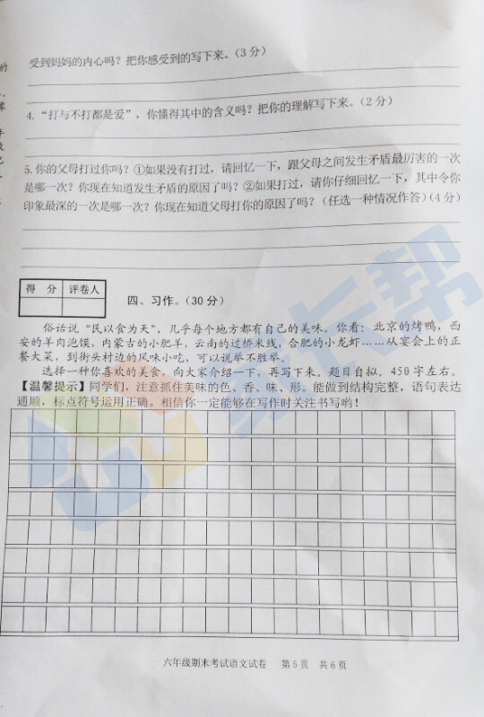 2016-2017学年合肥庐阳区六年级期末语文试卷(5)