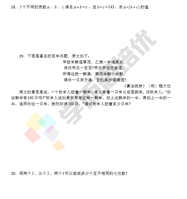 备战2017合肥五年级希望杯(1.20) 合肥家长帮 2017-01-20 18:16:28 2017年希望杯即将拉开帷幕,初赛于3月19日(周日)举行,4月9日(周日)进行决赛。 下面我们来给大家分享备战2017合肥五年级希望杯的试题啦~快练起来吧! 【1.20试题】 >>答案请点击查看 >>备战2017合肥希望杯每日一练汇总