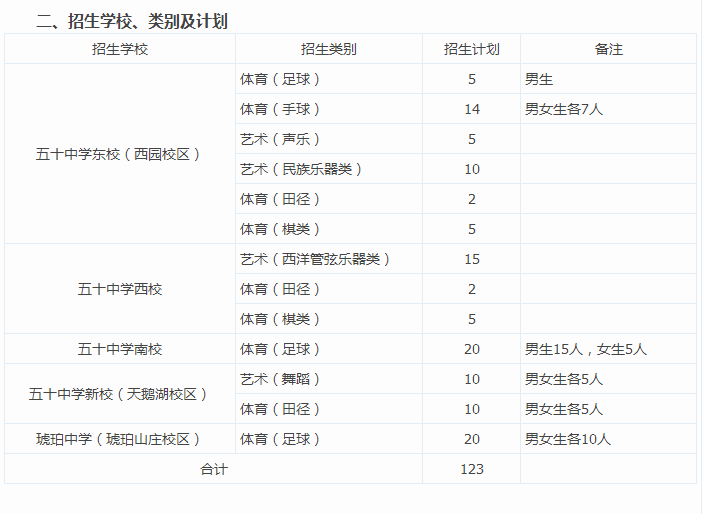 ①体育类。个人项目田径、棋类特长生报名条件:获得区级比赛第一名或市级前两名或省级前六名。集体项目足球特长生报名条件:获得市级比赛前三名或省、国家级比赛前六名的场上主力队员,或全国及省校园足球比赛三等奖以上的场上主力队员,每队申报不超过5人。集体项目手球特长生报名条件:获得市级比赛第一名或省级比赛前两名或国家级比赛前三名的场上主力队员,每队申报不超过4人。以上体育类获奖须是小学阶段在区级及以上教育主管部门、体育主管部门主办(或共同主办)的运动会或其它单项比赛中获得的奖项。