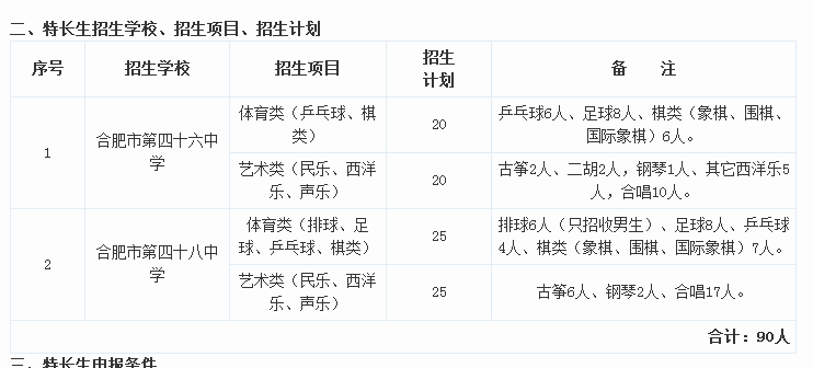 经省市批准我区合肥市第六十八中学、合肥一六八玫瑰园学校(合肥市第四十六中海恒分校、合肥市第四十五中芙蓉分校按总校统一政策)今年初中将招收体育和艺术特长生。4所学校招收特长生人数比例遵照省市相关文件执行。具有相关特长的小学毕业生,在本人自愿申请的基础上,由毕业学校推荐,招收学校招生办公室审核,招收相应的特长生。招收特长生的学校要按照区制定的招生办法认真组织实施,严禁学校以文化考试等方式录取特长生,6月24日前完成特长生录取工作。