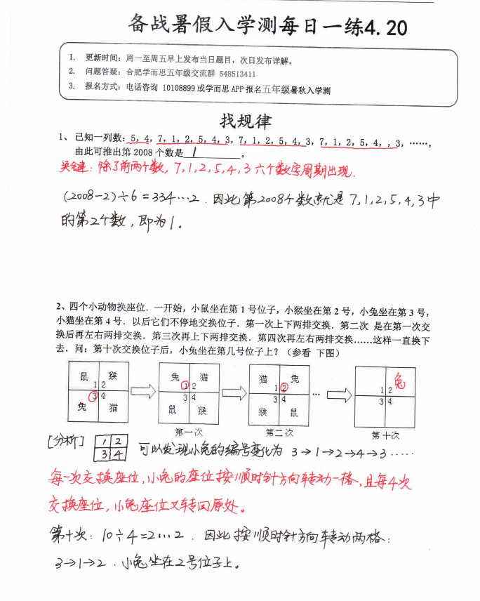 合肥五年级备战暑秋入学测解析——找规律