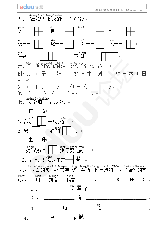 合肥小学一年级上册语文期末考试卷(一)(2)