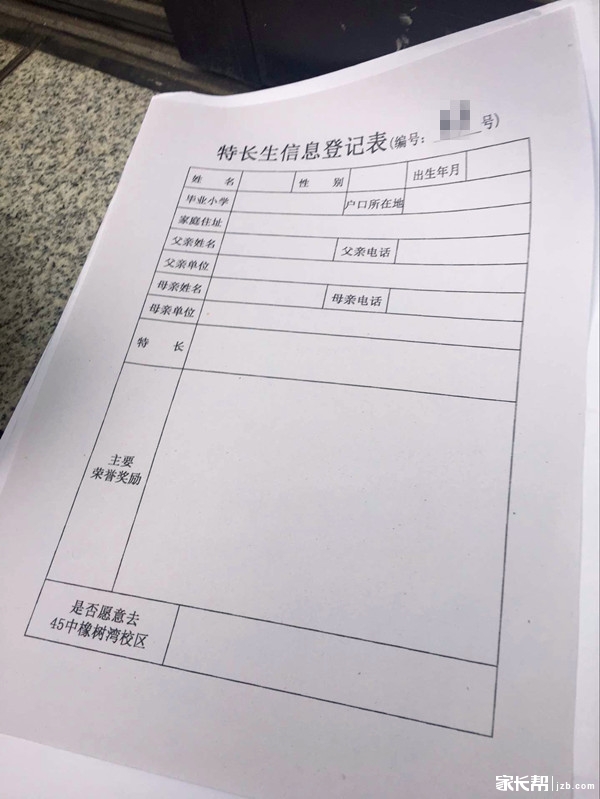 3、报名要求:由于报名是在门卫处登记,直接填写表格就行,要求是区级证书,实际上是不怎么审核,作文比赛证书都是可以的。成绩手册都不需要。总结下,2017年,45中本部的报名要求其实很低。