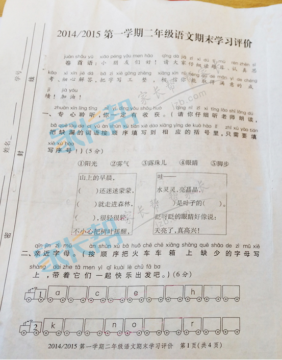 2014~2015合肥瑶海新站区小学二年级期末语文试卷