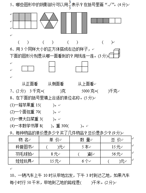 苏教版数学三年级上册期末数学水平测试卷(2)