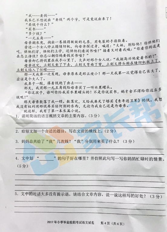 2016-2017合肥庐阳区下学期期末考六年级语文试卷(4)