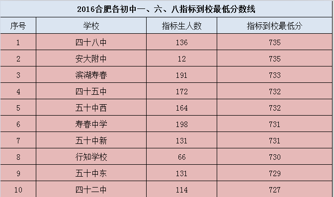 这是2016年合肥一六八指标到校最低分最高的10所学校。大家可基本可以看到,都是比较好的学校。