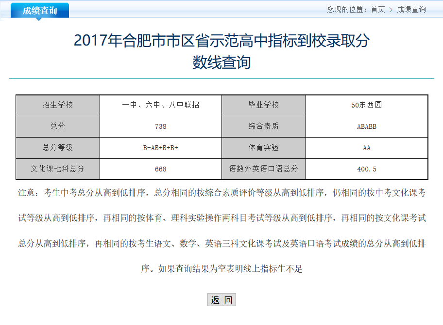 2017年合肥50中东西园校区一六八指标到校最低分数线