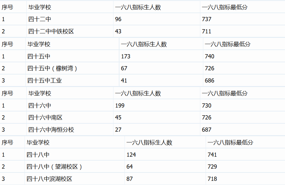 2、四十六南区和四十六本部的一六八指标到校最低分差的不多,但是要看到名额差距很多。