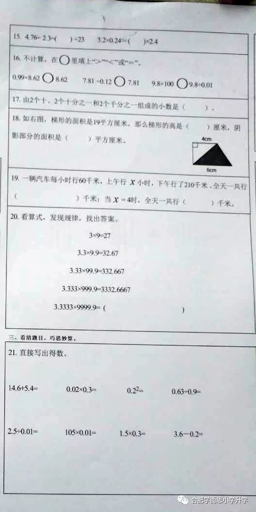 2017-2018合肥五年级上学期学业水平测试数学试卷(4)