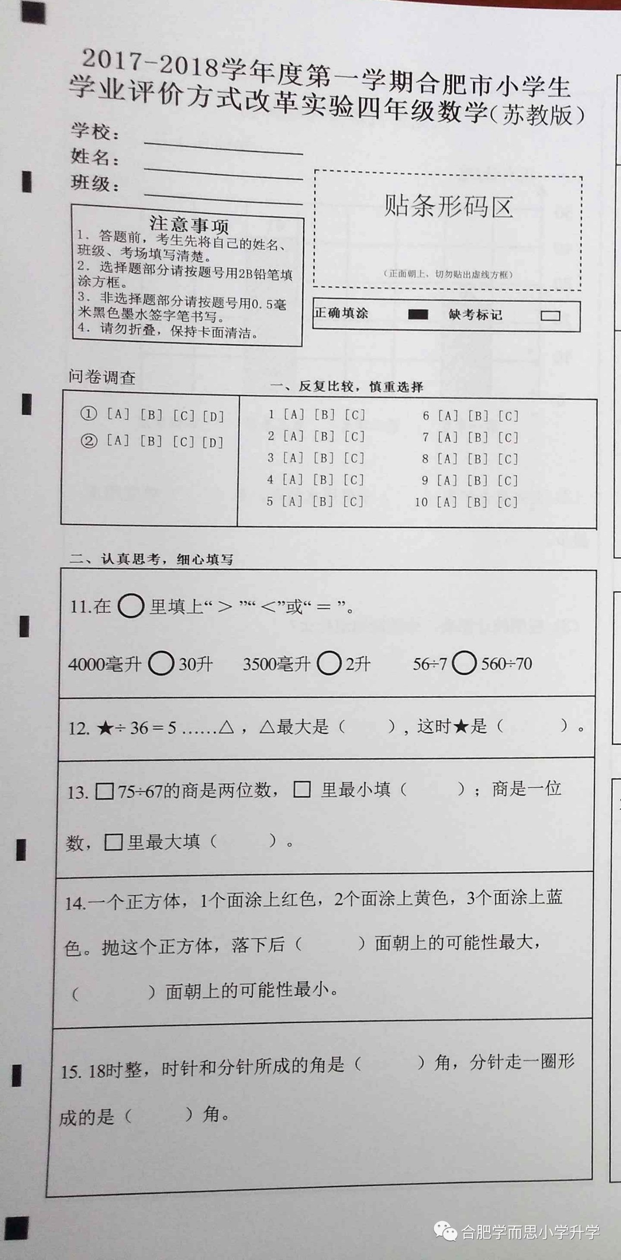 2017-2018合肥四年级上学期学业水平测试数学试卷(3)