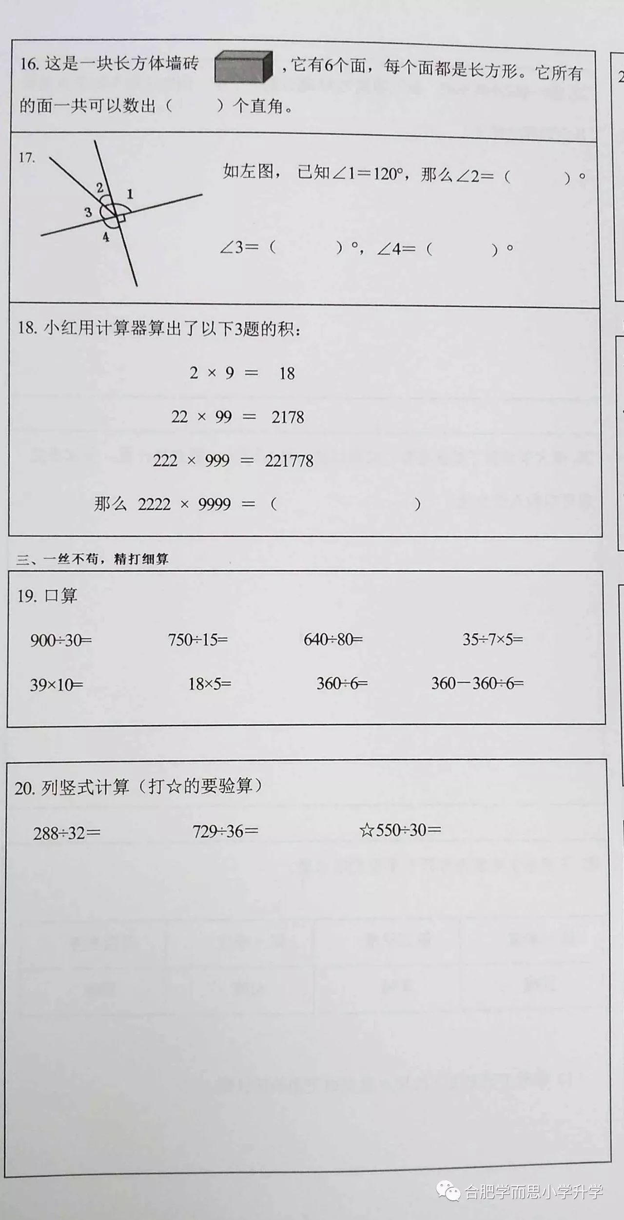 2017-2018合肥四年级上学期学业水平测试数学试卷(4)