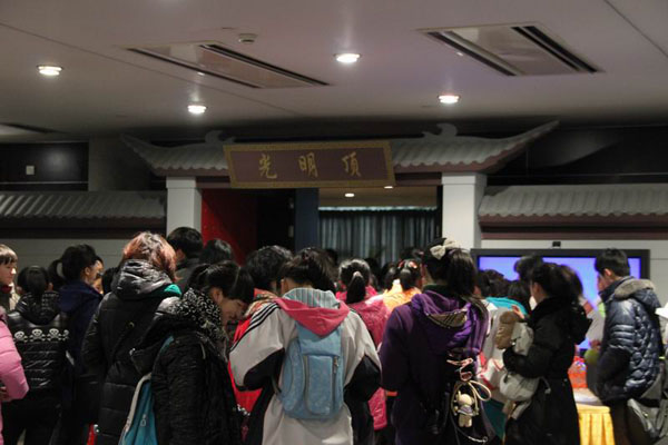 我们一行人来到顶楼的“光明顶”,这里面原本应该住着明教的人,但是他们用此当作了会议室,里面有一个巨大的屏幕,上面记录着阿里的各项实时情况,包括淘宝网的实时销售情况,屏幕上飞快的显示各类正在被人们搜索的品牌,我们看到了很多知名品牌LOGO的显示,有些同学好奇地问,为什么有些那么快的飞过,有些则速度那么慢?讲解员告诉我们:速度越慢的说明在此时搜索这个品牌的人越多。更有同学开玩笑的说:那我坐在这里看一天,都知道哪些品牌大家感兴趣,明天我就回去开一家人们网店,肯定就会赚啦。
