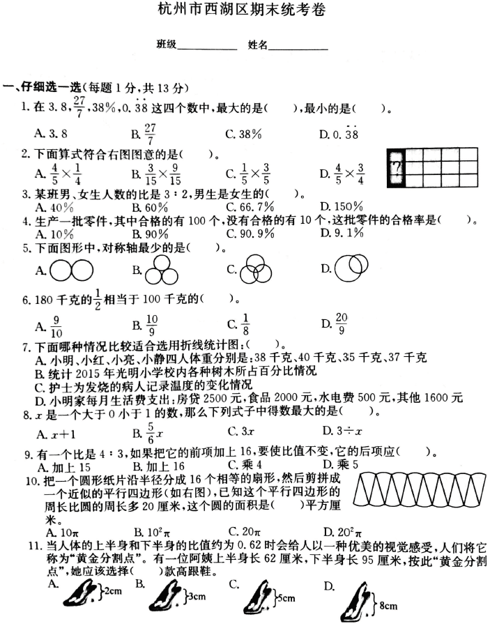 2015-2016年杭州西湖区六上期末考试数学试卷