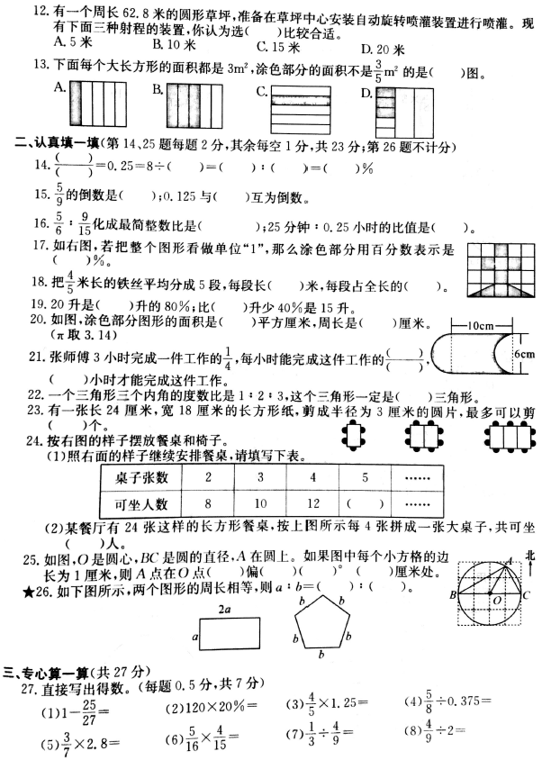 2015-2016年杭州西湖区六上期末考试数学试卷(2)