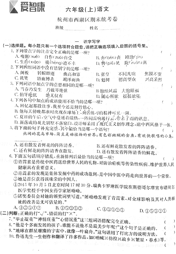 2015-2016年杭州西湖区六上期末考试语文试卷