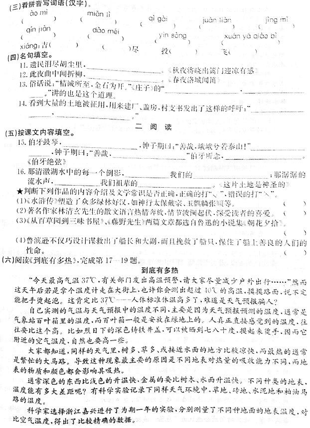2015-2016年杭州西湖区六上期末考试语文试卷(2)