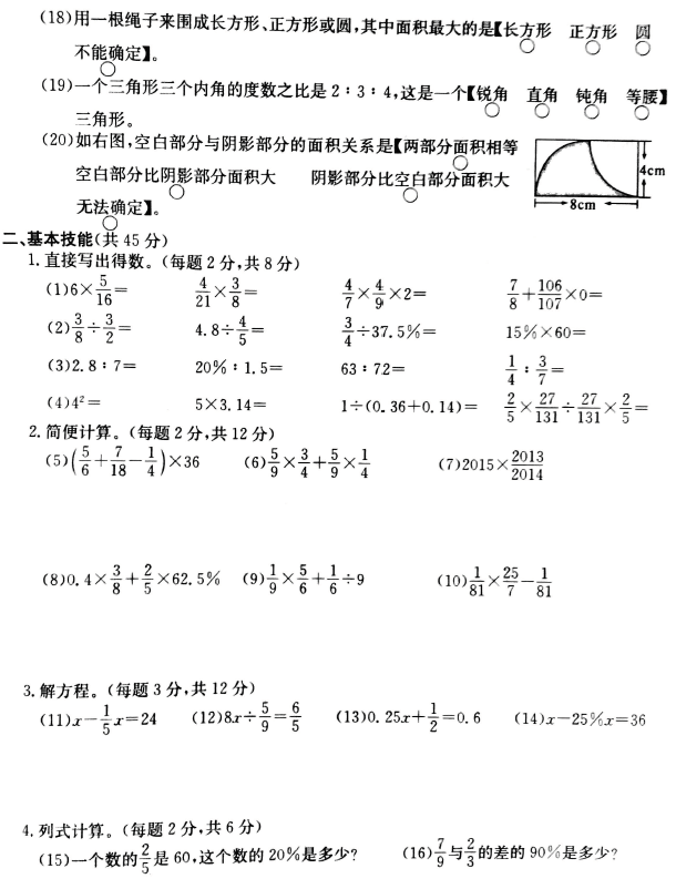 2015-2016年杭州萧山区六上期末考试数学试卷(2)
