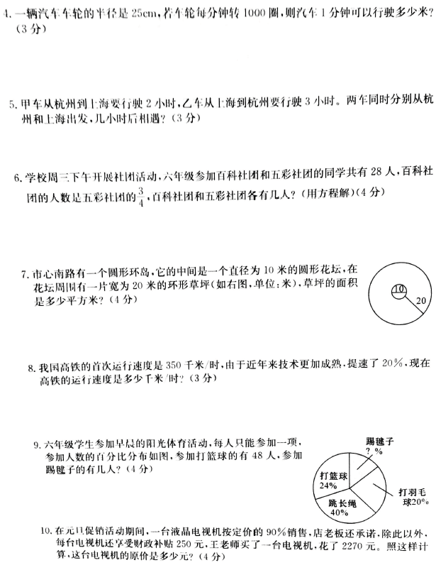 2015-2016年杭州萧山区六上期末考试数学试卷(4)
