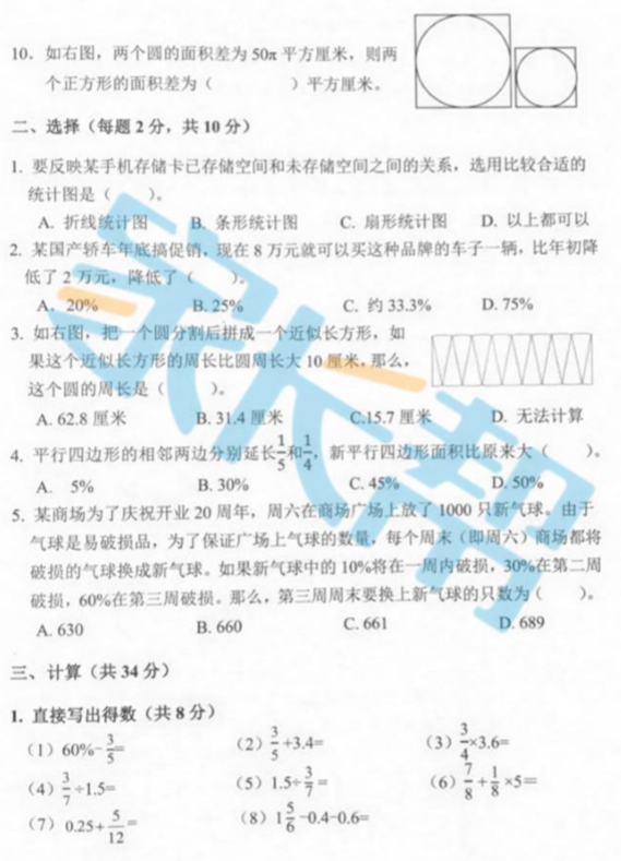 2015-2016年杭州上城区六上期末考试数学试卷(2)