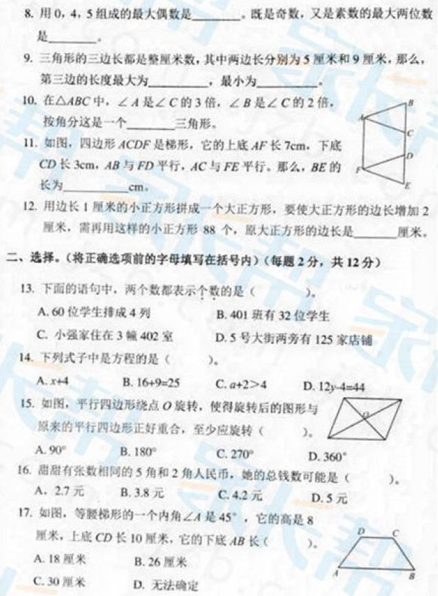 2017年杭州上城区四年级数学期末统测试卷(2)