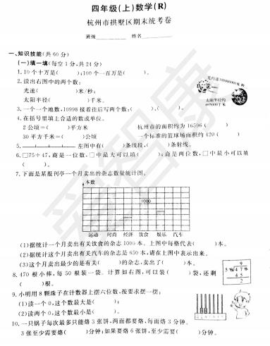 2018杭州四年级数学拱墅区试题