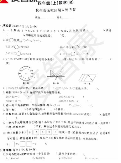 2018杭州四年级数学余杭区试题