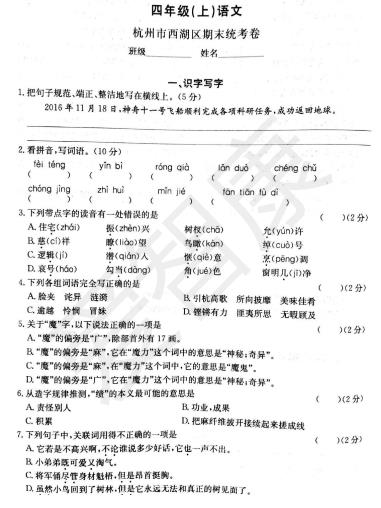 2018杭州四年级语文西湖区期末试卷