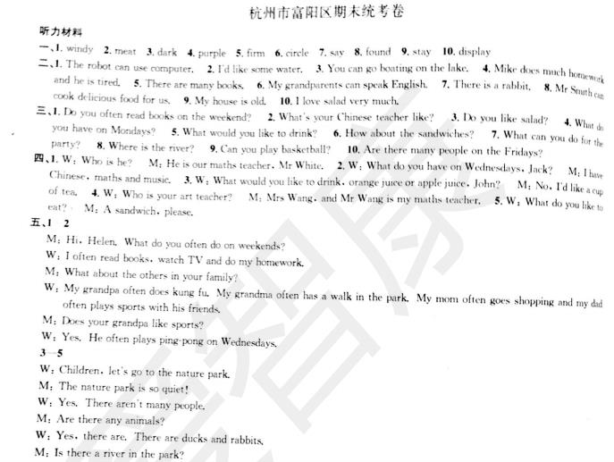 2018杭州五年级英语富阳区期末试卷答案