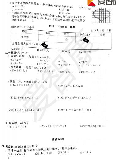 2018杭州五年级数学江干区期末试卷(2)