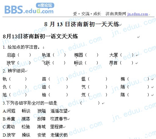 济南新初一语数外预习2012.8.13天天练