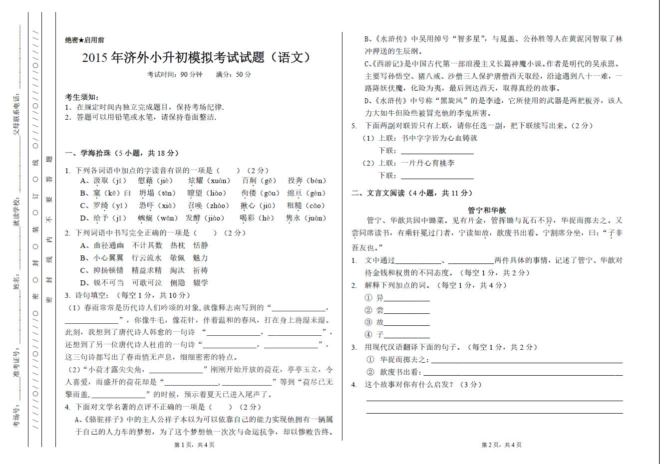 2015济南外国语小升初模考语数英试题答案(5)