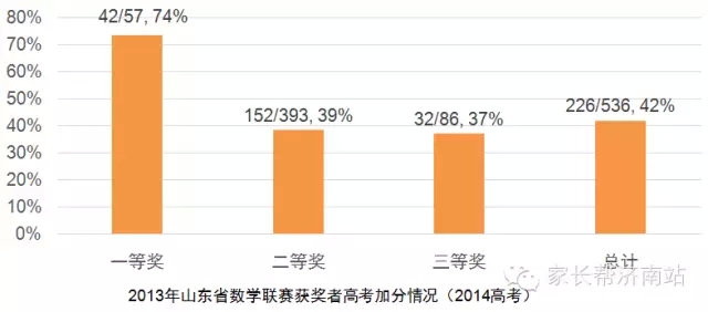 图中可以看到,山东省高中数学联赛一等奖获得者有57位,其中42人高考加分;二等奖获得者有393位,其中152人高考加分;三等奖获得者有86位,其中32人高考加分。高考加分的获奖者比例高达42%,由此可见联赛获奖在高考中的优势还是相当明显的。