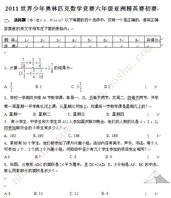 2011世界少年奥林匹克数学竞赛六年级亚洲精英赛初赛