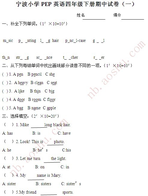 | 宁波小学PEP英语四年级下册期中试卷(一) |