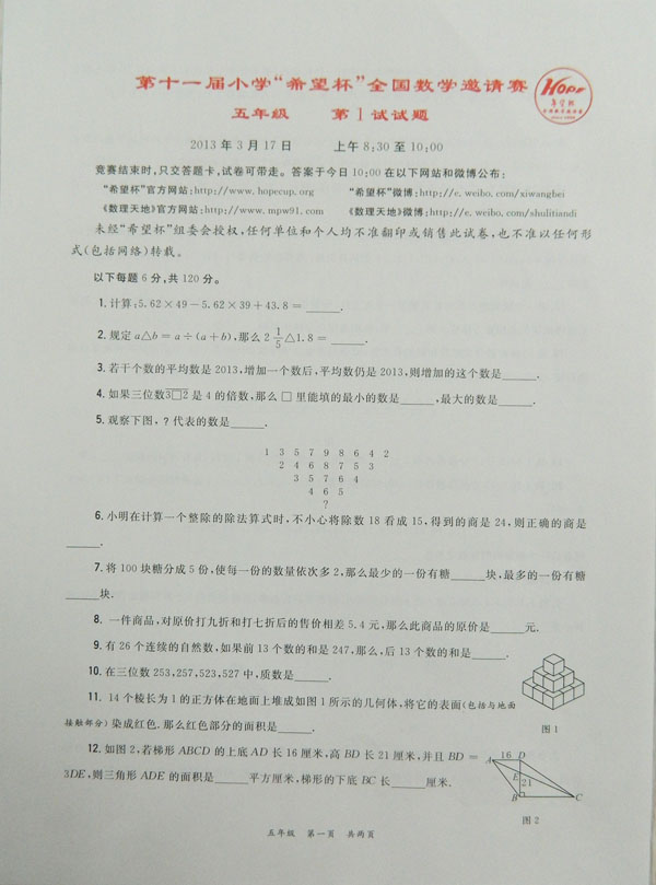 2013年第十一届小学希望杯五年级初赛试题(1-12题)